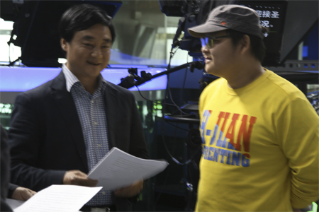 進(jìn)入演播廳前與節(jié)目組工作人員交流